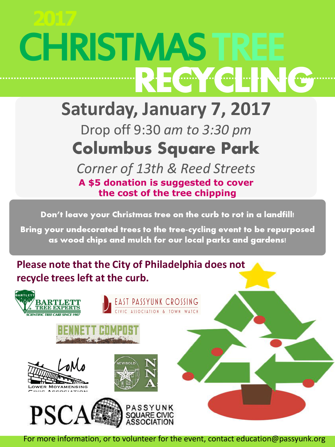 Christmas Tree Recycling on Saturday, January 7 Posted on December 19, 2016February 20, 2017 by rachel Share this: Click to share on Facebook (Opens in new window) Facebook More Click to email a link to a friend (Opens in new window) Email Click to print (Opens in new window) Print Click to share on X (Opens in new window) X Click to share on Pinterest (Opens in new window) Pinterest Click to share on Tumblr (Opens in new window) Tumblr Like Loading... Related