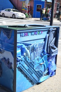 In the fall, after selecting the corners and the artist, the TRASH ACADEMY put on a fun and informative promotional family event at the corner of 10th & Wolf. It was promoted with the invite, Come crash our trash party! The artist from RAIR was there to present several design ideas and solicit feedback.