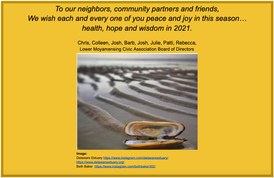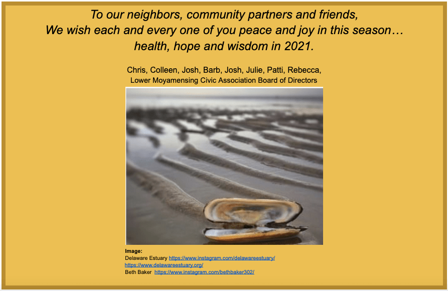 Holiday Message Posted on December 23, 2020December 24, 2020 by Lower Moyamensing Civic Association Share this: Click to share on Facebook (Opens in new window) Facebook More Click to email a link to a friend (Opens in new window) Email Click to print (Opens in new window) Print Click to share on X (Opens in new window) X Click to share on Pinterest (Opens in new window) Pinterest Click to share on Tumblr (Opens in new window) Tumblr Like Loading... Related