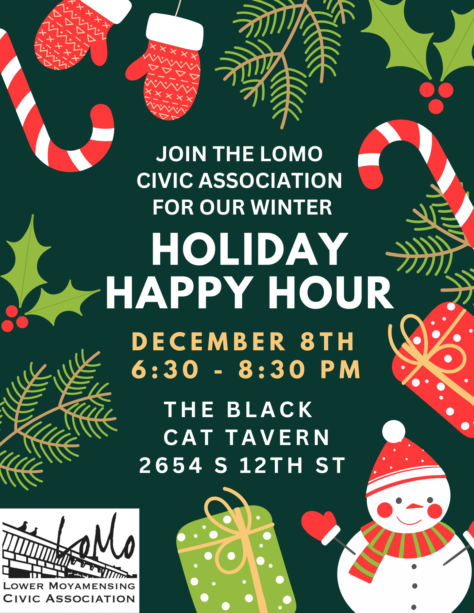 Holiday Happy Hour Dec. 8th at the Black Cat Tavern Posted on December 2, 2022December 2, 2022 by Lower Moyamensing Civic Association Share this: Click to share on Facebook (Opens in new window) Facebook More Click to email a link to a friend (Opens in new window) Email Click to print (Opens in new window) Print Click to share on X (Opens in new window) X Click to share on Pinterest (Opens in new window) Pinterest Click to share on Tumblr (Opens in new window) Tumblr Like Loading... Related