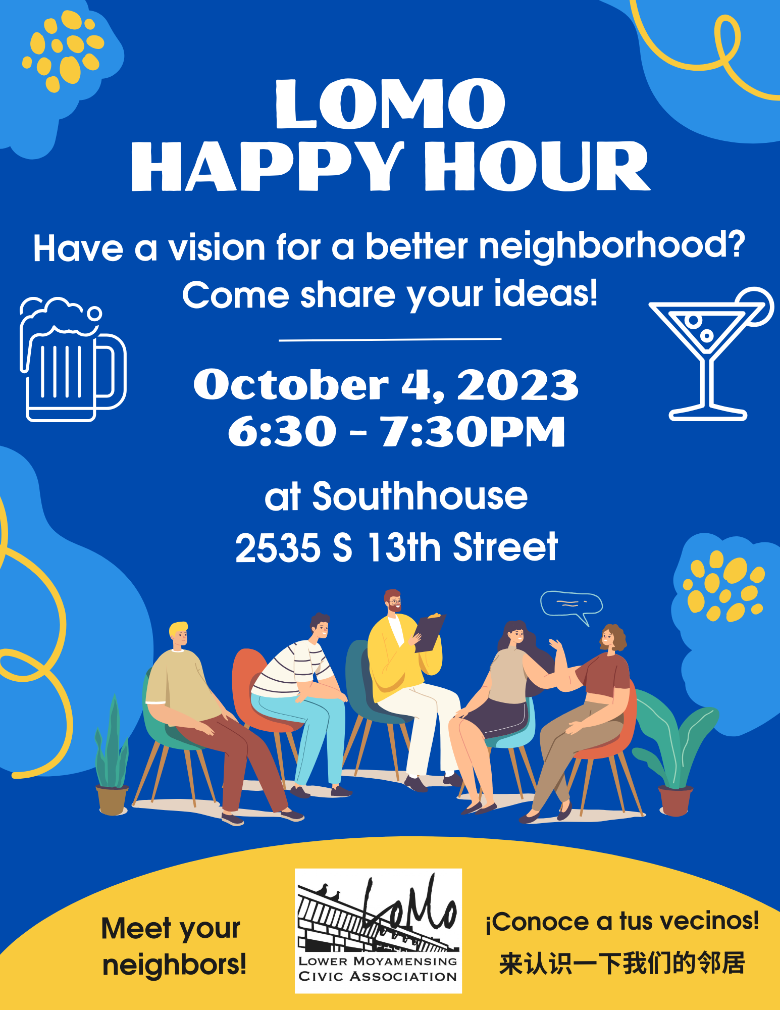 October 4th Happy Hour Posted on September 30, 2023September 30, 2023 by Lower Moyamensing Civic Association Share this: Click to share on Facebook (Opens in new window) Facebook More Click to email a link to a friend (Opens in new window) Email Click to print (Opens in new window) Print Click to share on X (Opens in new window) X Click to share on Pinterest (Opens in new window) Pinterest Click to share on Tumblr (Opens in new window) Tumblr Like Loading... Related