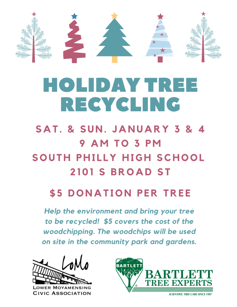 Holiday Treecycle 2026 Posted on January 2, 2026January 2, 2026 by Lower Moyamensing Civic Association Share this: Click to share on Facebook (Opens in new window) Facebook More Click to email a link to a friend (Opens in new window) Email Click to print (Opens in new window) Print Click to share on X (Opens in new window) X Click to share on Pinterest (Opens in new window) Pinterest Click to share on Tumblr (Opens in new window) Tumblr Like Loading... Related