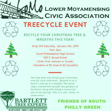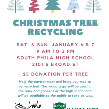 Recycle your Christmas tree in 2020 at South Philly High, 2101 South Broad Street. Saturday, January 4, 9 am to Noon Sunday, January 5, Noon to 3 pm A $5 donation is suggested.