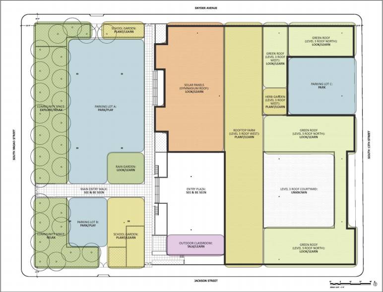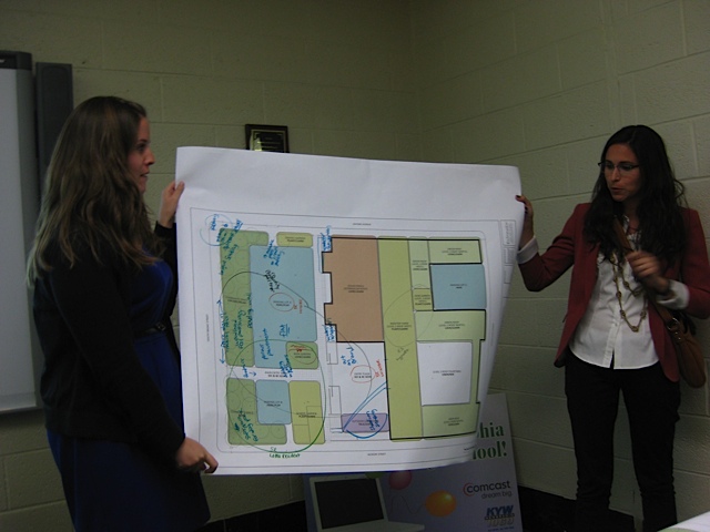 Ideas included: Koi pond, amphitheater, playground, solar panels, rooftop farm, green roofs, rooftop event space, medicinal garden, exercise path, meditation garden, porous pavement, rain gardens, outdoor classroom, fence removal, sports fields, bicycle parking, skate park, and Broad Street greening.
