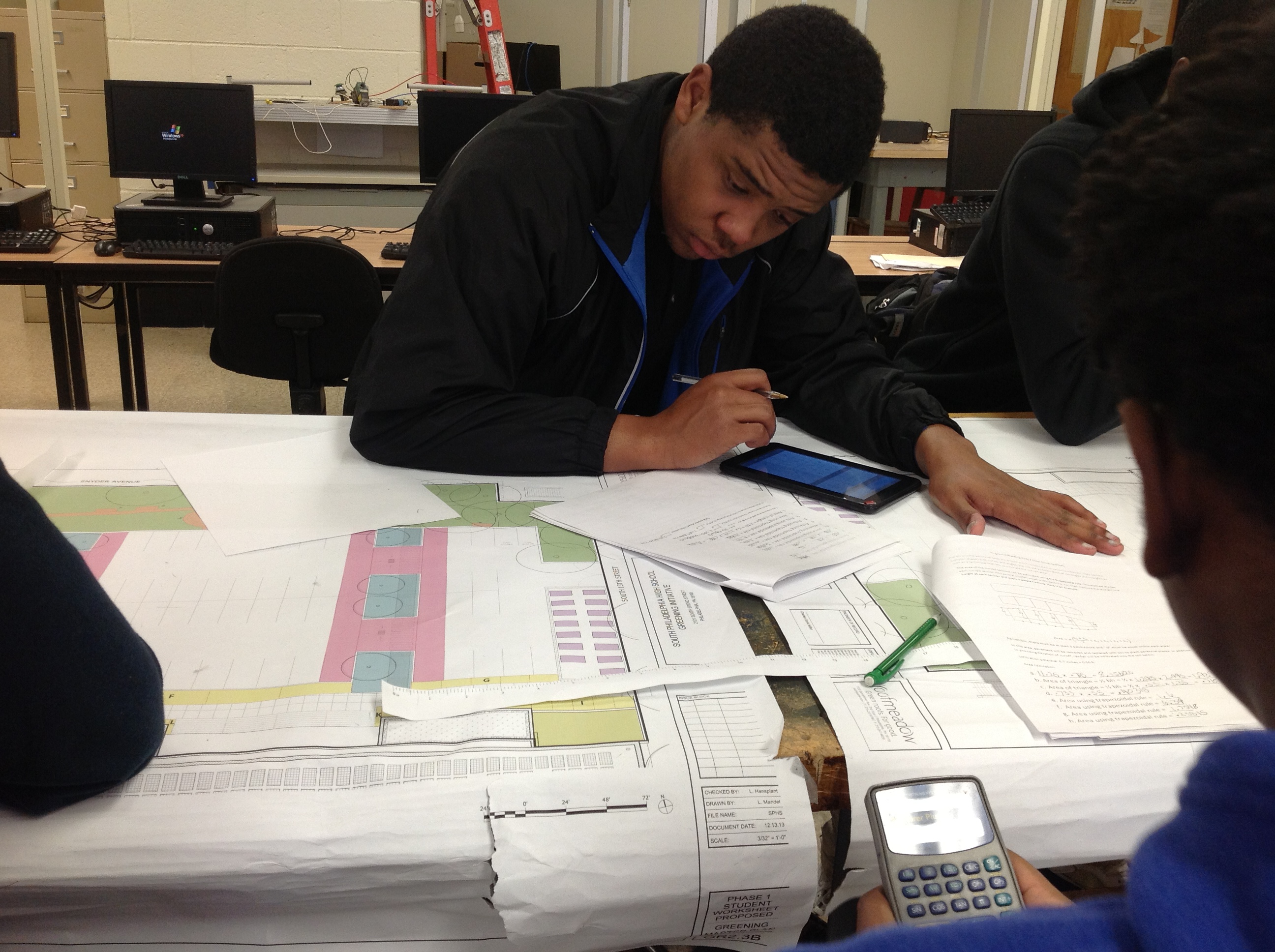 Engineering: Engineering CTE (Career Technical Education) classes collaborated with Roofmeadow to calculate the amount of stormwater that will be diverted when the ‘Greening’ Master Plan is fully implemented. This information is useful for urban greening and sustainability grants, many of which focus on stormwater management. Charlie Miller and Tim Resler, Roofeadow PE and civil engineer respectively, first taught the students about stormwater management through the context of the ‘Greening’ Master Plan and then dove into the mathematics. Students attended the 2013 Greenbuild International Expo and visited the Cira Green Roof construction (both trips were made possible by Delaware Valley Green Building Council).